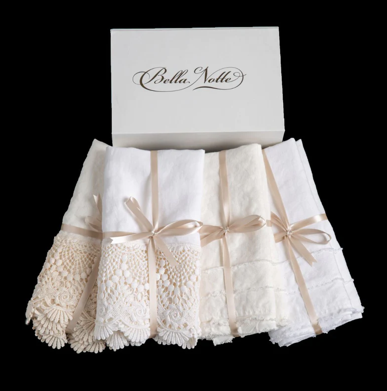 The Mattine Guest Towel features an elegant cotton lace motif on linen. The stippled and scalloped patterns are a refined embellishment on both ends of Bella's signature linen. Available in White and Winter White.