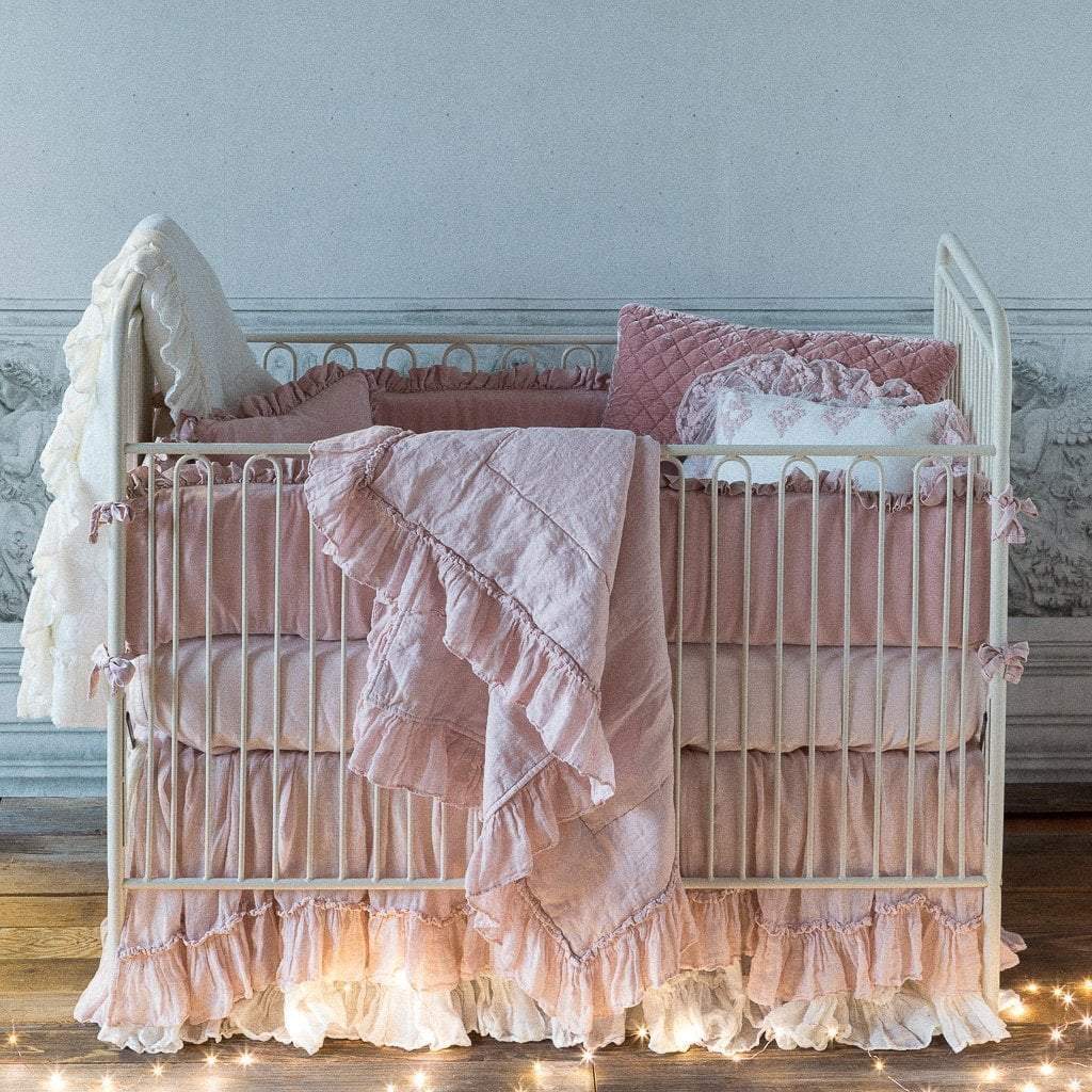 An ethereal 5" whisper weight ruffle and petite ruffle trim adorn all four sides of Bella's Linen Whisper Baby Comforter, the perfect compliment to a soft Linen body. Lightly padded, machine washable, and garment dyed to order using low impact dyes, this enchanting comforter is the epitome of casual elegance, and a Bella nursery essential.